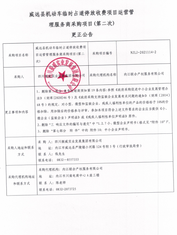 威远县机动车临时占道停放收费项目运营管理服务商采购项目(第二次)更正公告
