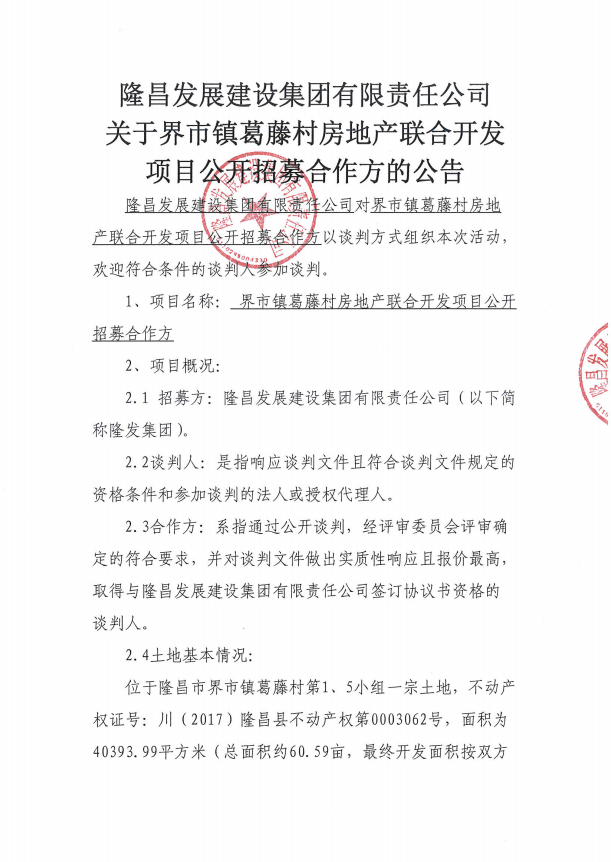 隆昌发展建设集团有限责任公司关于界市镇葛藤村房地产联合开发项目公开招募合作方的公告