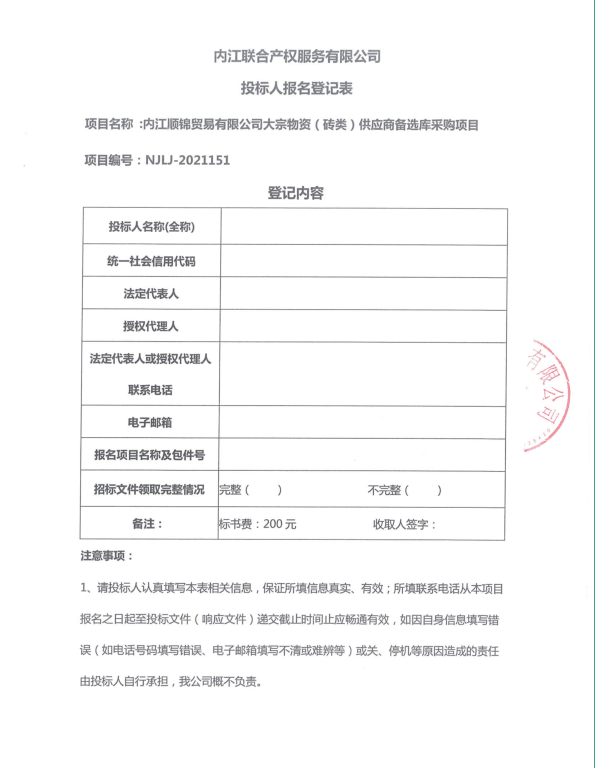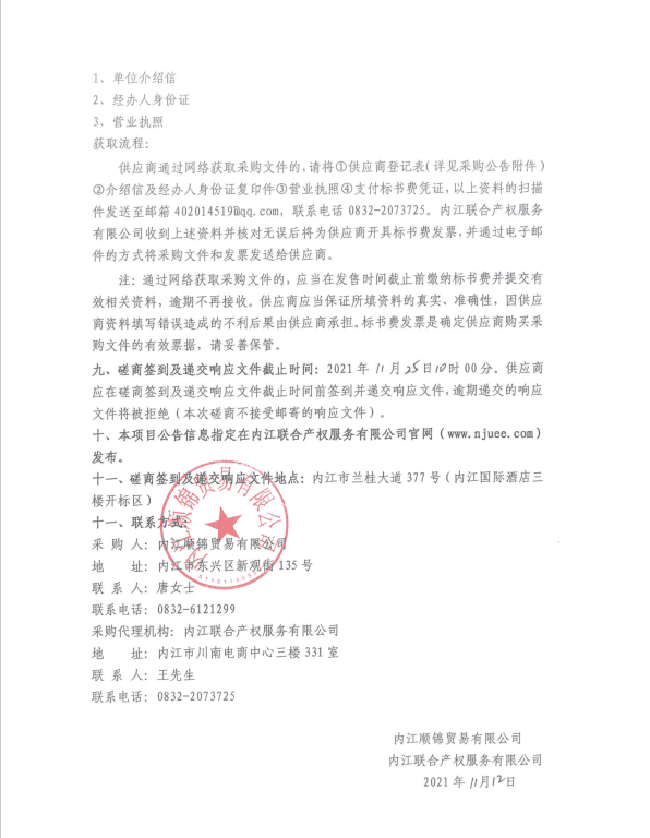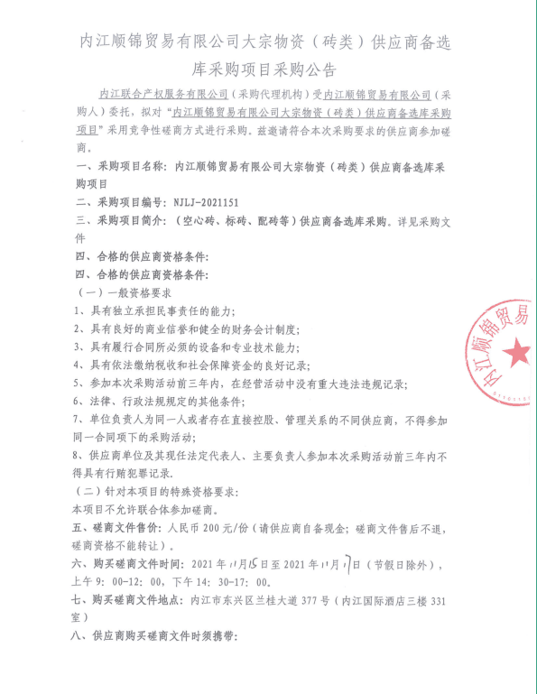 内江顺锦贸易有限公司大宗物资(砖类)供应商备选库采购项目采购公告