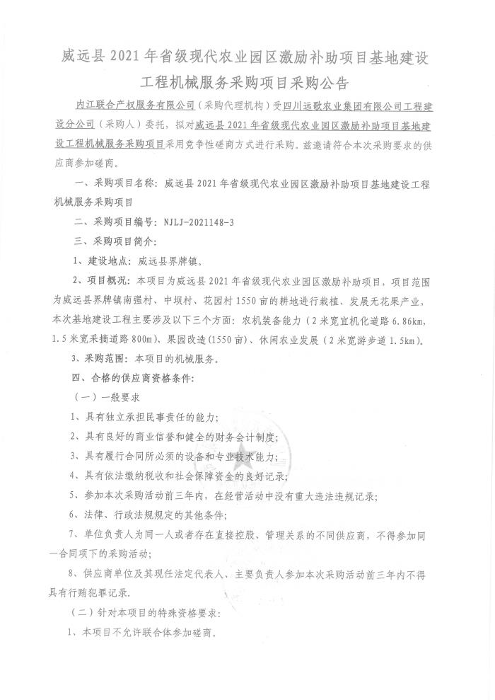 威远县2021年省级现代农业园区激励补助项目基地建设工程机械服务采购项目采购公告
