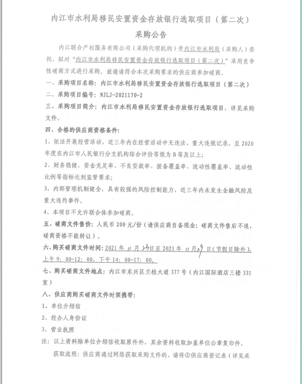 内江市水利局移民安置资金存放银行选取项目(第二次)采购公告