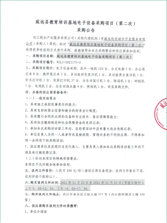 威远县教育培训基地电子设备采购项目(第二次)采购公告