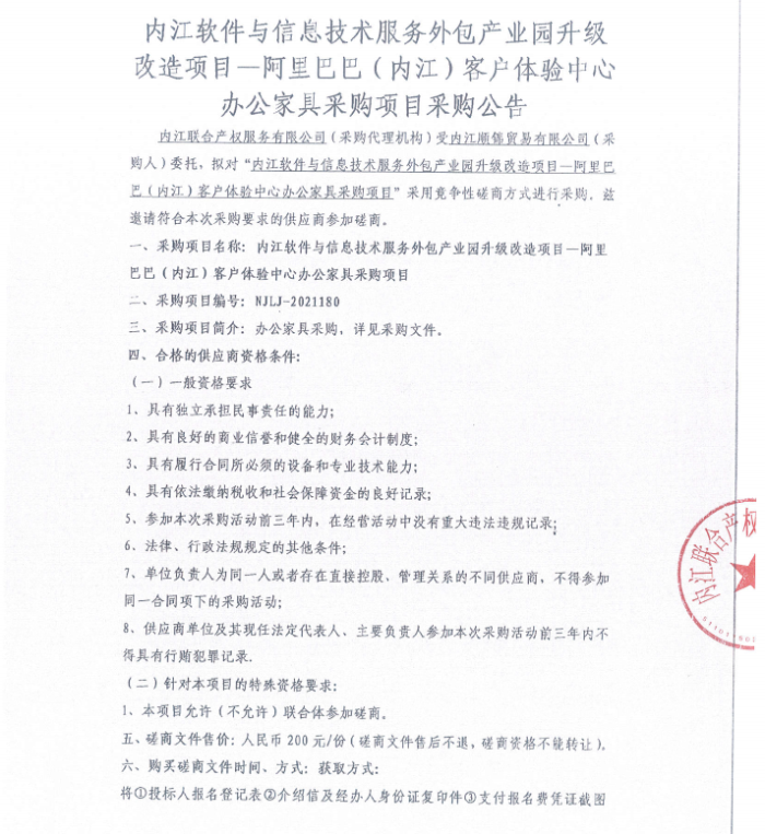 内江软件与信息技术服务外包产业园升级改造项目—阿里巴巴(内江)客户体验中心办公家具采购项目采购公告