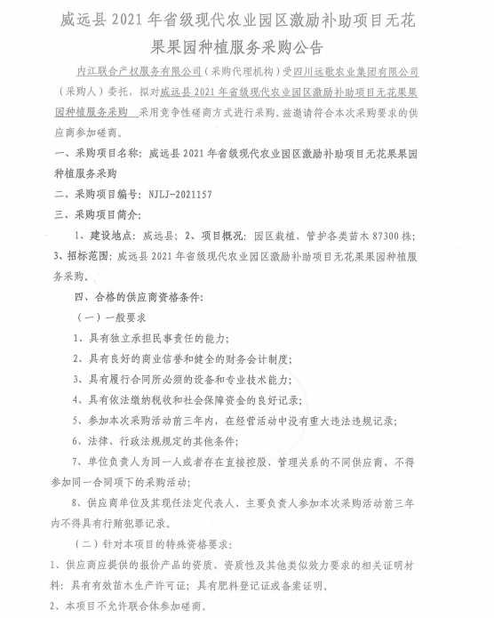 威远县2021年省级现代农业园区激励补助项目无花果果园种植服务采购公告