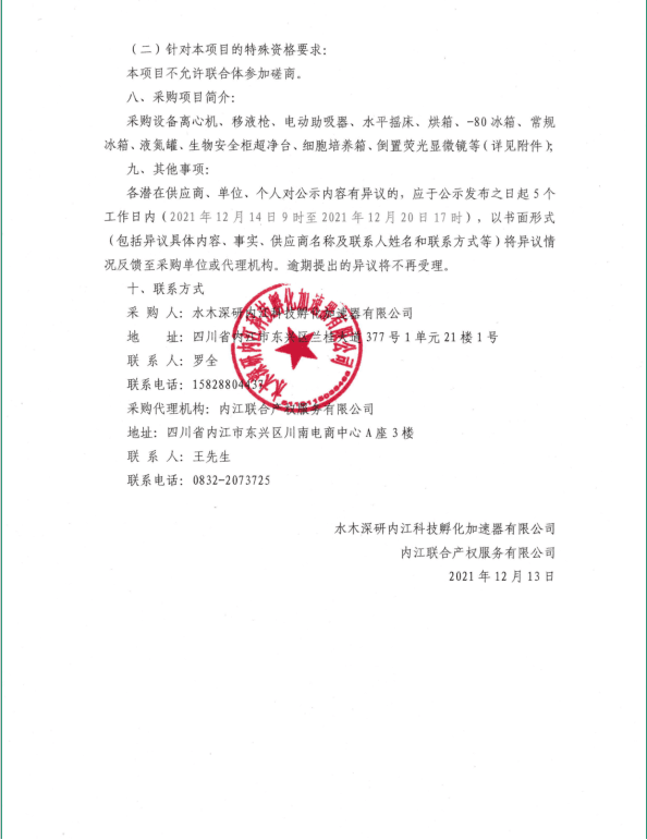 关于拟采用单一来源方式采购水木深研内江科技孵化加速器有限公司细胞治疗设备采购项目的征求意见公示