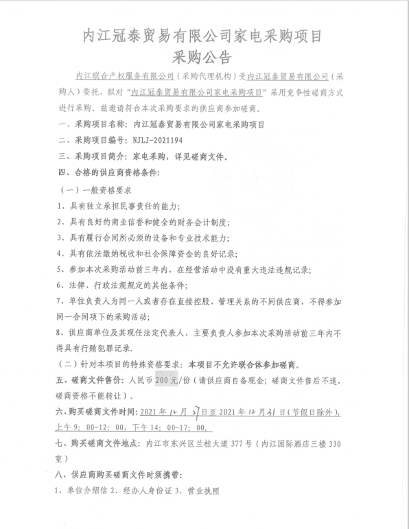 内江冠泰贸易有限公司大宗物资(混凝土类)供应商备选库采购项目(第二批次)采购公告