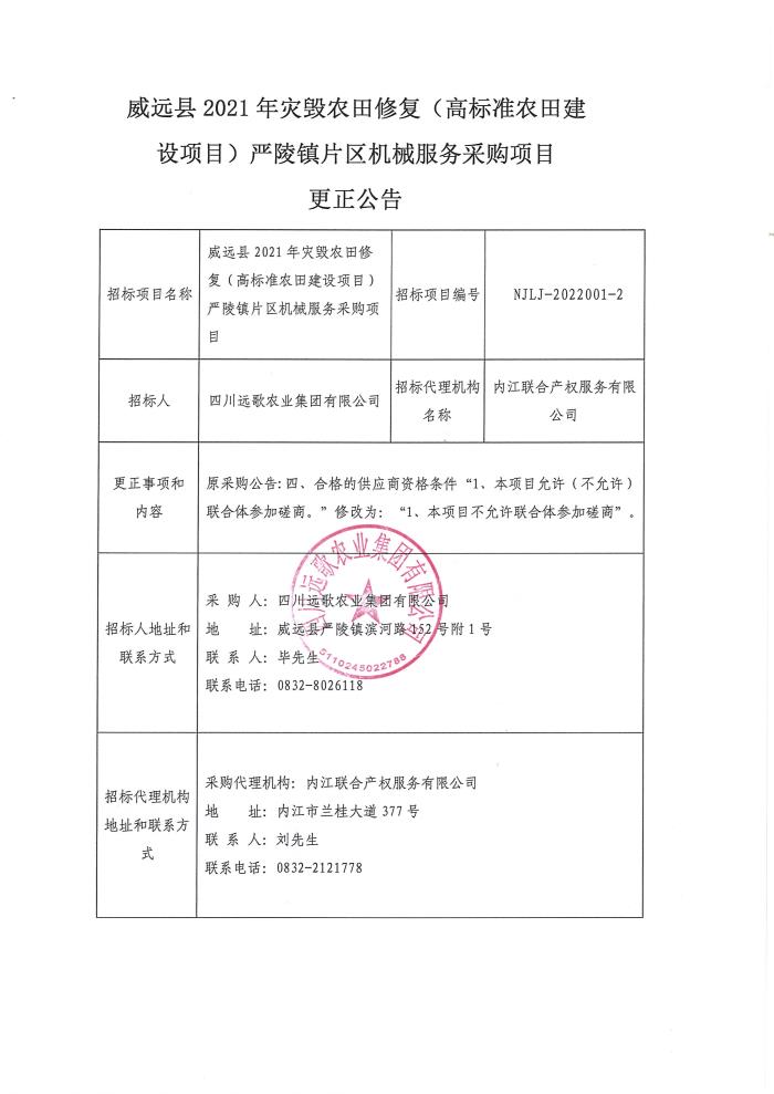 威远县2021年灾毁农田修复(高标准农田建设项目)严陵镇片区机械服务采购项目更正公告