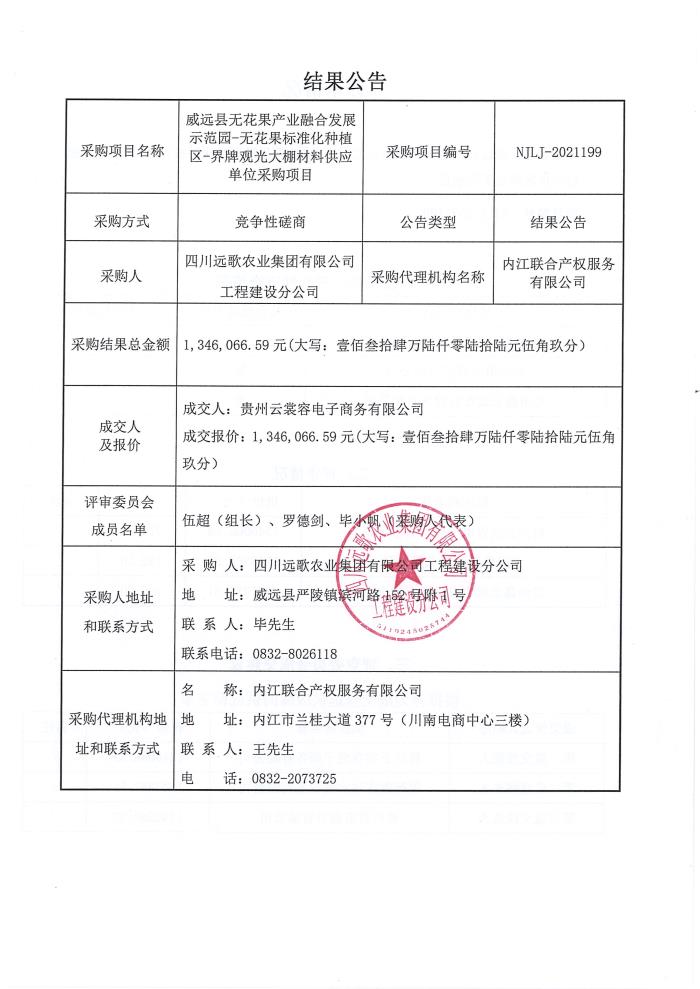 威远县无花果产业融合发展示范园-无花果标准化种植区-界牌观光大棚材料供应单位采购项目结果公告