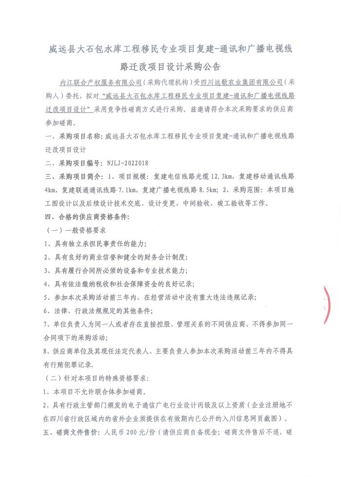 威远县大石包水库工程移民专业项目复建-通讯和广播电视线路迁改项目设计采购公告