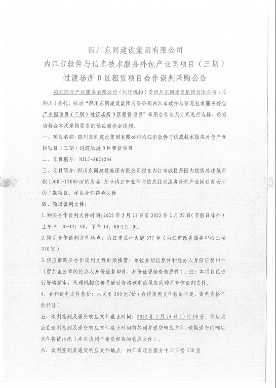 四川东同建设集团有限公司内江市软件与信息技术服务外包产业园项目(三期)过渡场所D区租赁项目合作谈判采购公告