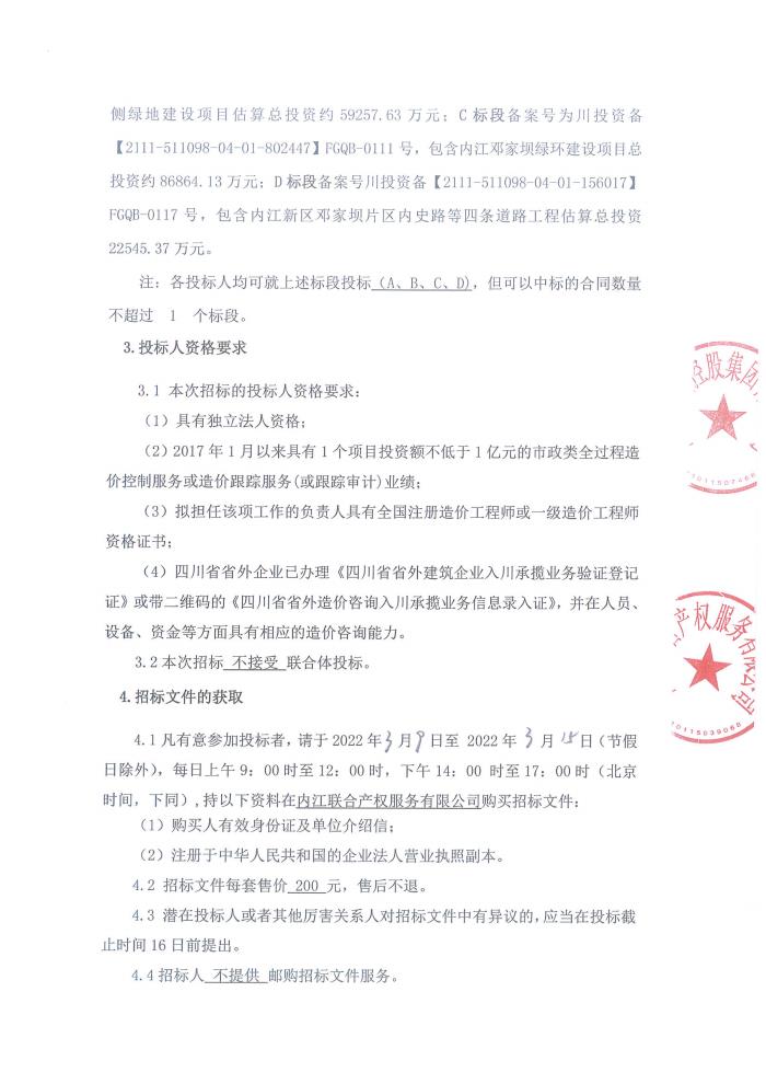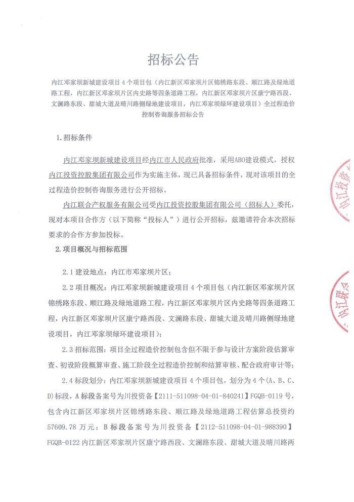 内江邓家坝新城建设项目4个项目包(内江新区邓家坝片区锦绣路东段、顺江路及绿地道路工程,内江新区邓家坝片区内史路等四条道路工程,内江新区邓家坝片区康宁路西段、文澜路东段、甜城大道及晴川路侧绿地建设项目,内江邓家坝绿环建设项目)全过程造价控制咨询服务招标公告