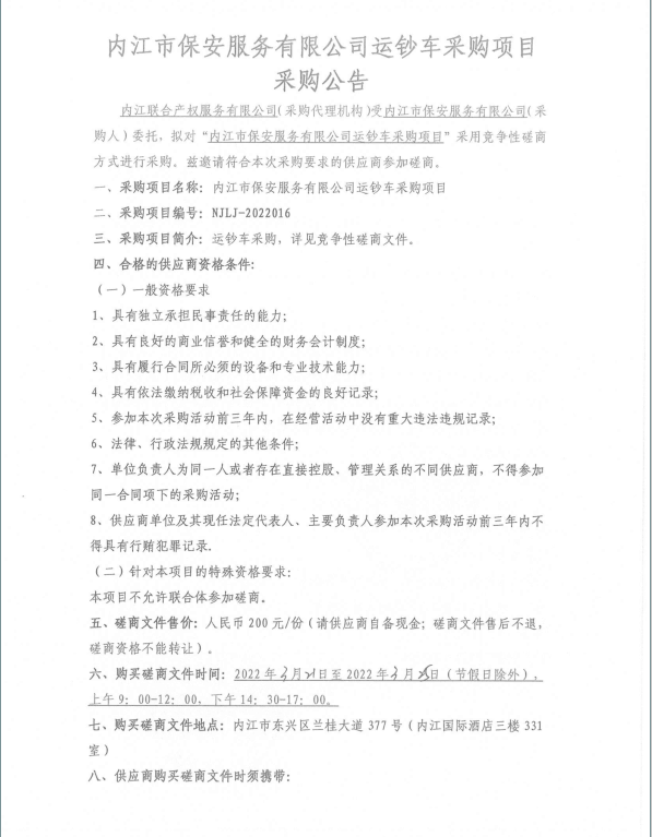 内江市保安服务有限公司运钞车采购项目采购公告