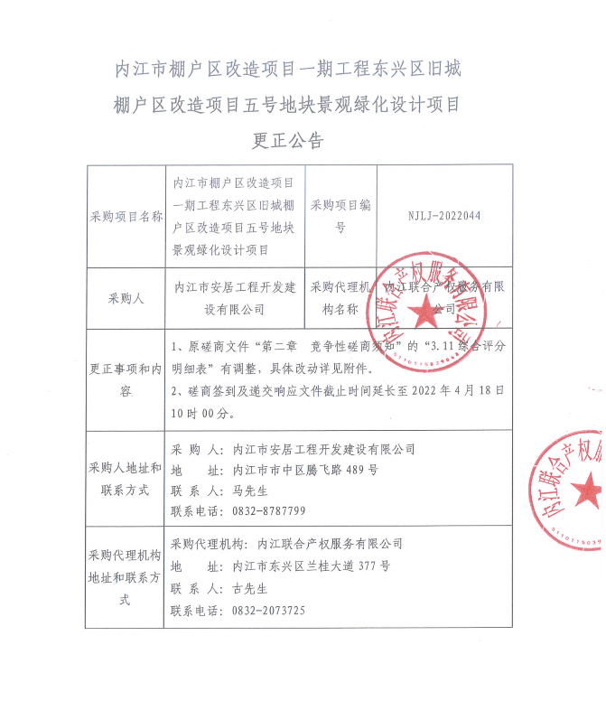 内江市棚户区改造项目一期工程东兴区旧城棚户区改造项目五号地块景观绿化设计项目更正公告
