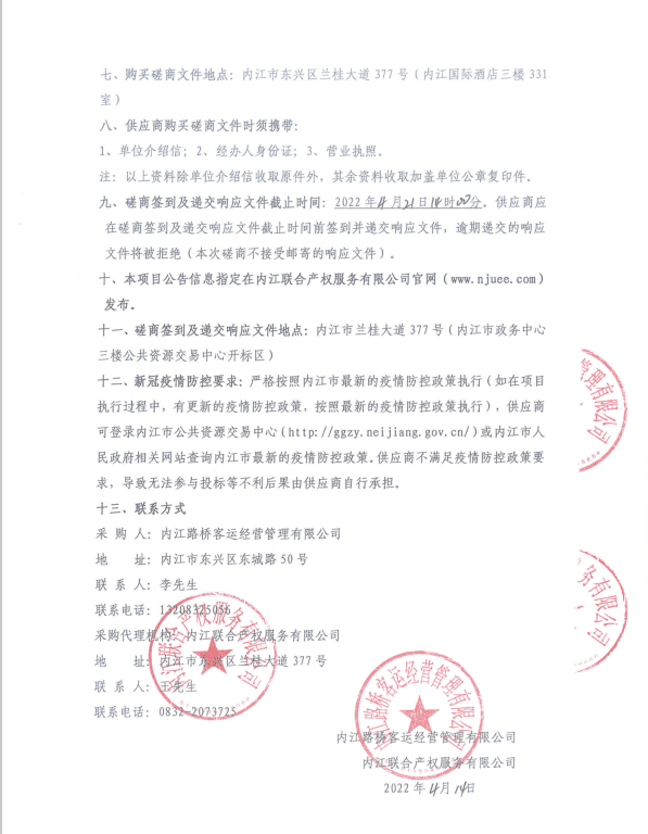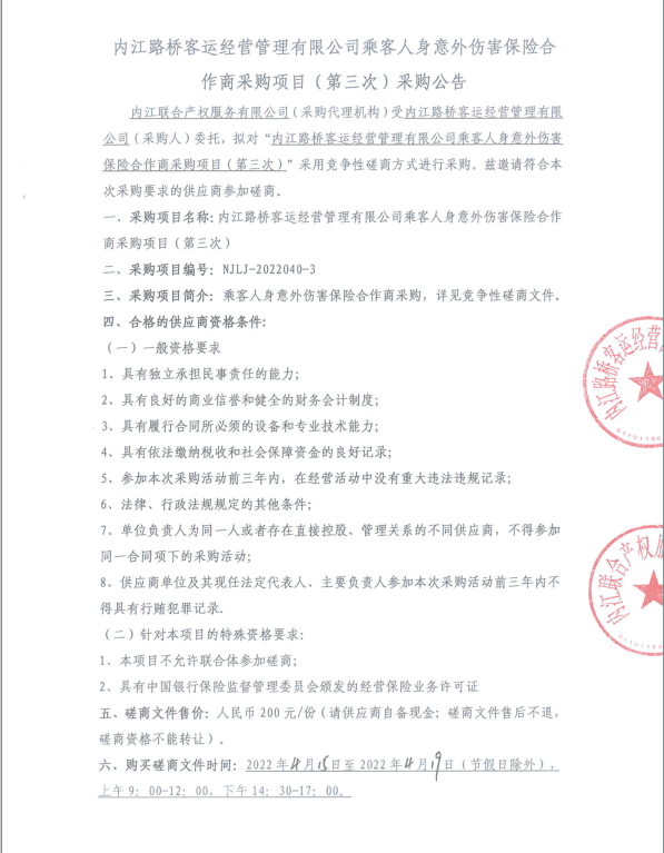 内江路桥客运经营管理有限公司乘客人身意外伤害保险合作商采购项目(第三次)采购公告