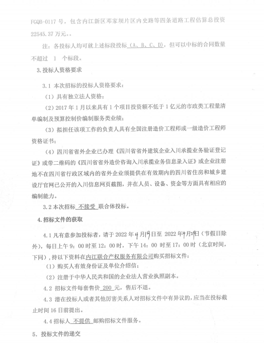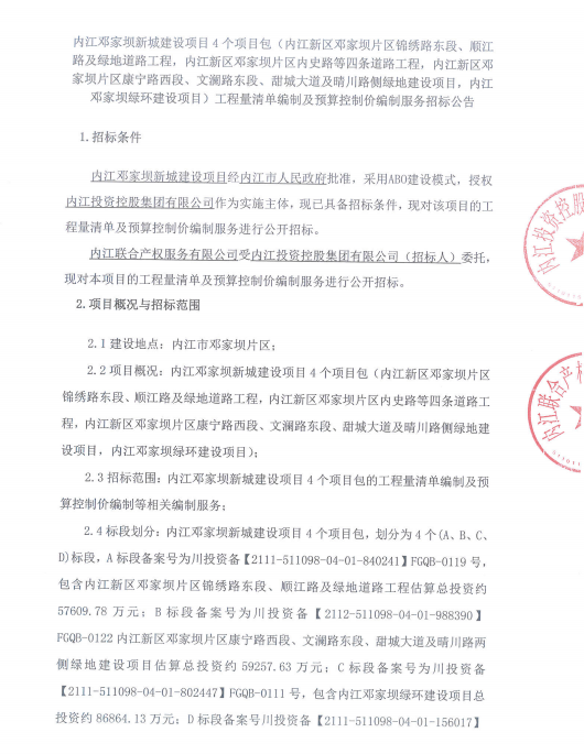 内江邓家坝新城建设项目4个项目包(内江新区邓家坝片区锦绣路东段、顺江路及绿地道路工程,内江新区邓家坝片区内史路等四条道路工程,内江新区邓家坝片区康宁路西段、文澜路东段、甜城大道及晴川路侧绿地建设项目,内江邓家坝绿环建设项目)工程量清单编制及预算控制价编制服务招标公告