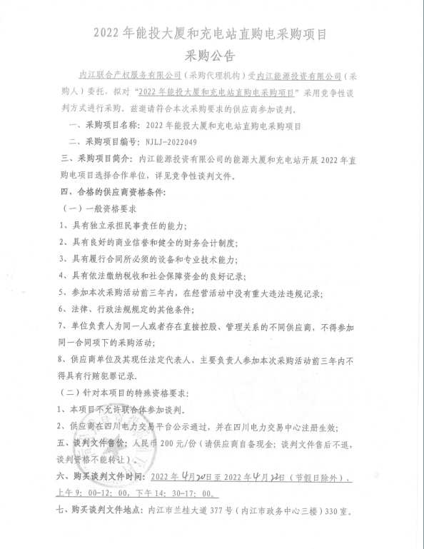 2022年能投大厦和充电站直购电采购项目采购公告
