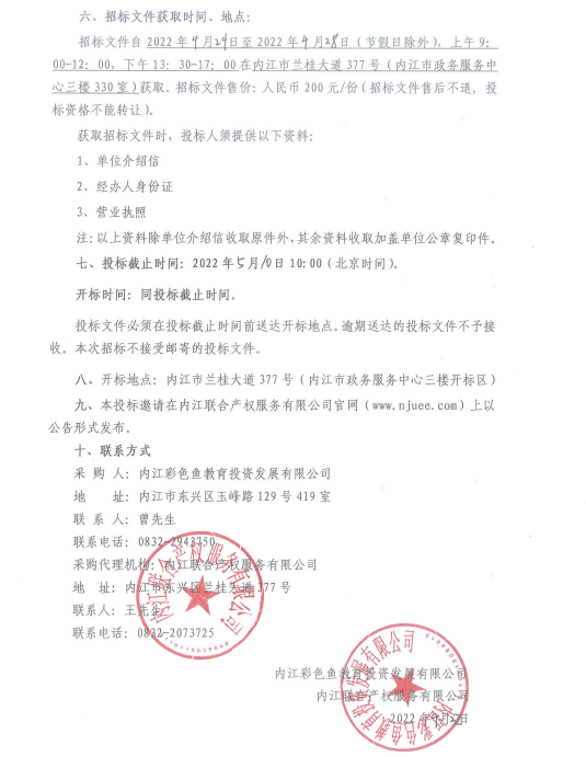 内江彩色鱼教育投资发展有限公司甜品手工室室内装修工程项目招标公告