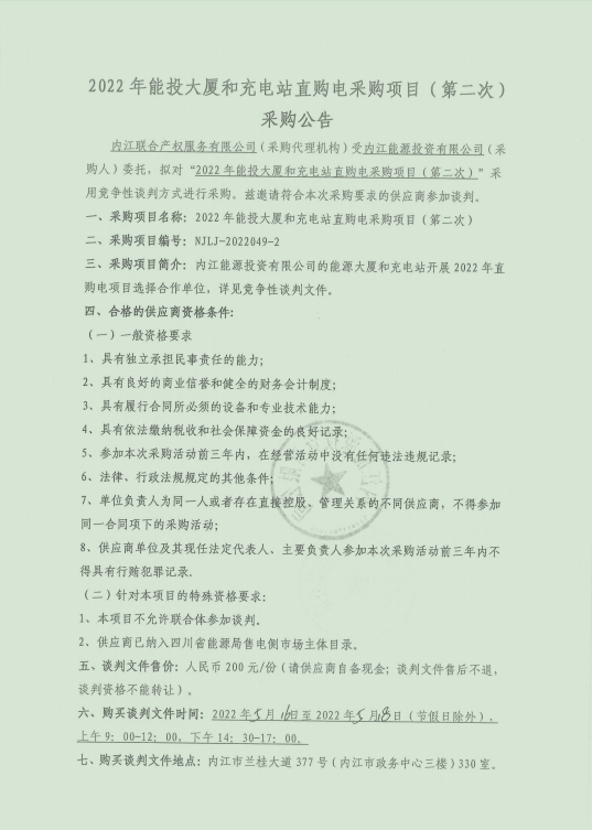 2022年能投大厦和充电站直购电采购项目(第二次)采购公告