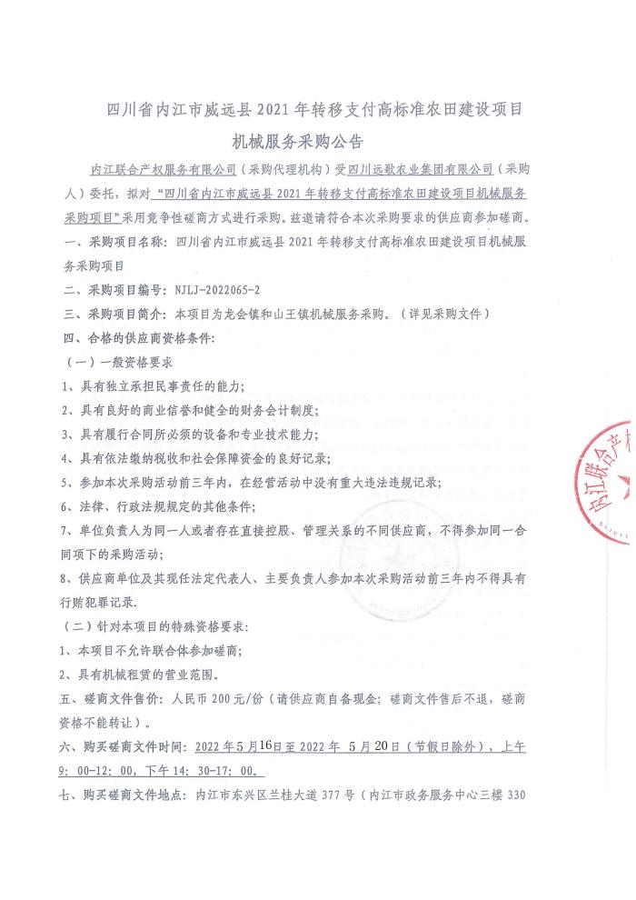 四川省内江市威远县2021年转移支付高标准农田建设项目劳务单位采购公告