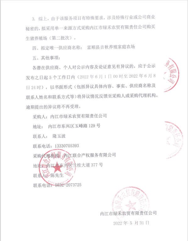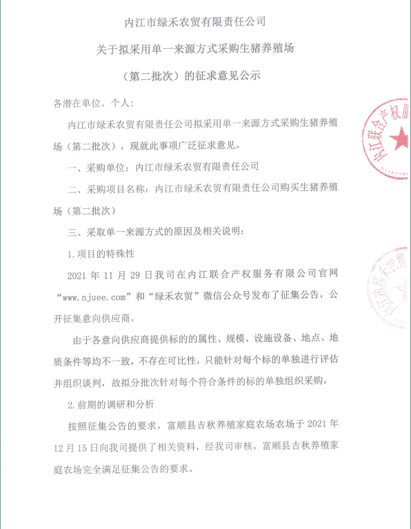 内江市绿禾农贸有限责任公司关于拟采用单一来源方式采购生猪养殖场(第二批次)的征求意见公示