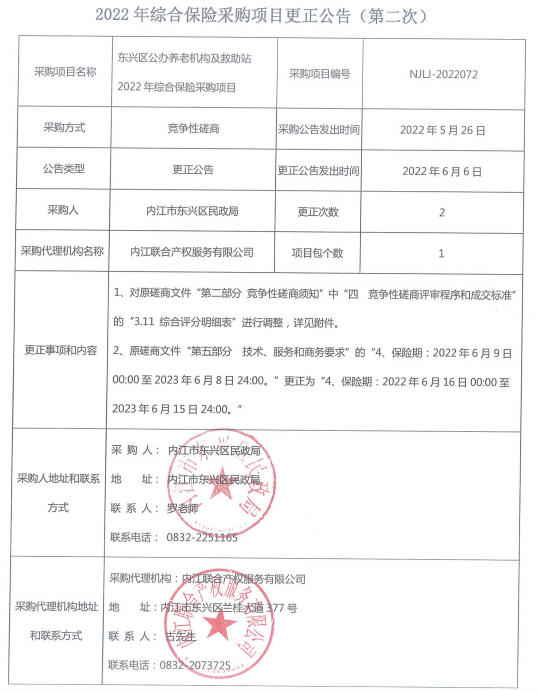 东兴区公办养老机构及救助站2022年综合保险采购项目更正公告(第二次)