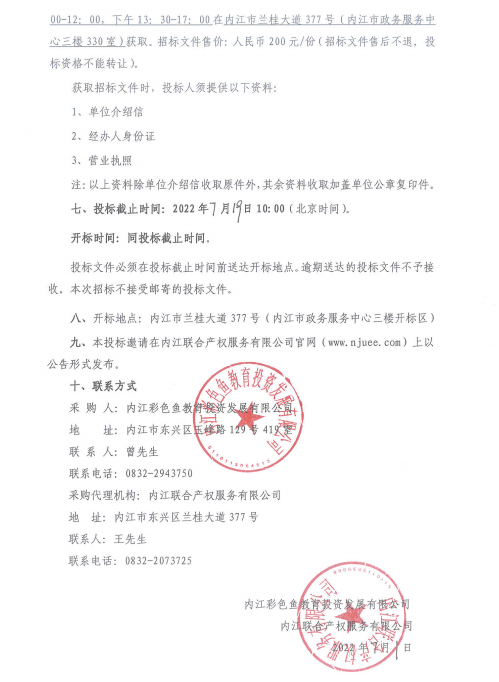 内江彩色鱼幼儿园园服、被套、书包采购项目招标公告