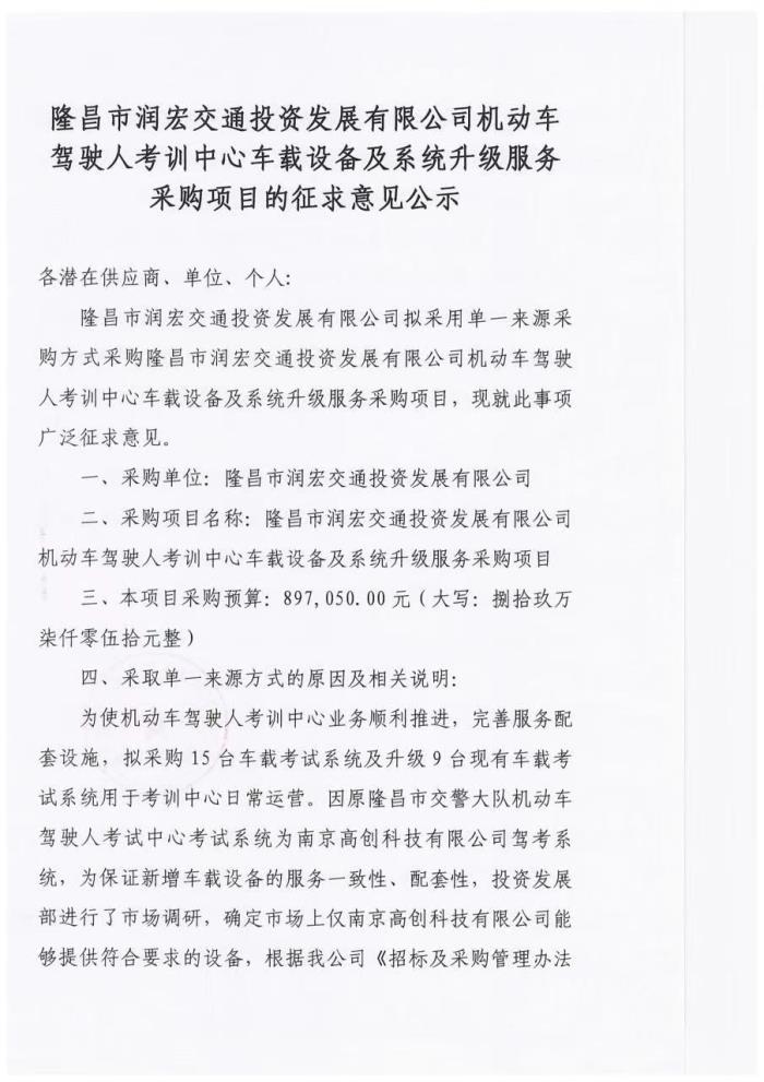 隆昌市润宏交通投资发展有限公司机动车驾驶人考训中心车载设备及系统升级服务采购项目的征求意见公示