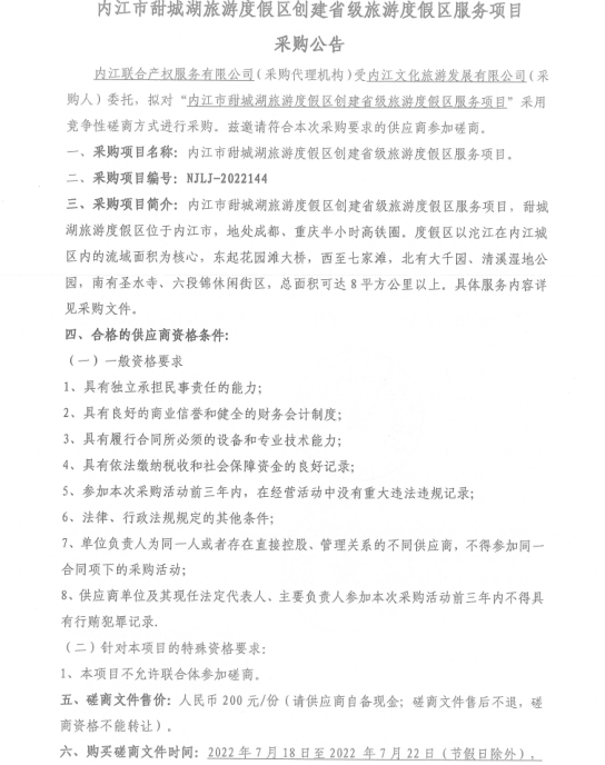 内江市甜城湖旅游度假区创建省级旅游度假区服务项目采购公告