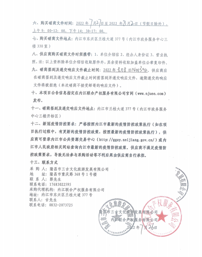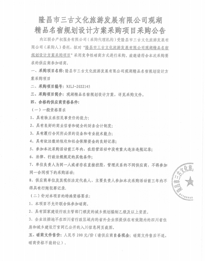 隆昌市三古文化旅游发展有限公司观湖精品名宿规划设计方案采购项目采购公告