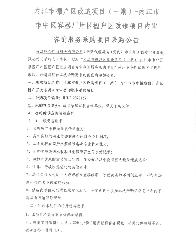 内江市棚户区改造项目(一期)-内江市市中区容器厂片区棚户区改造项目内审咨询服务采购项目采购公告
