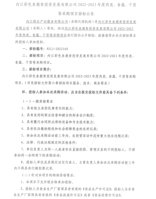 内江彩色鱼教育投资发展有限公司2022-2023年度肉类、食蔬、干货等采购项目招标公告