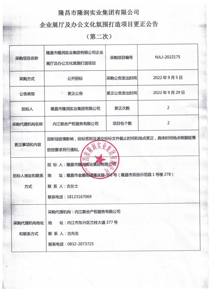 隆昌市隆润实业集团有限公司 企业展厅及办公文化氛围打造项目更正公告(第二次)