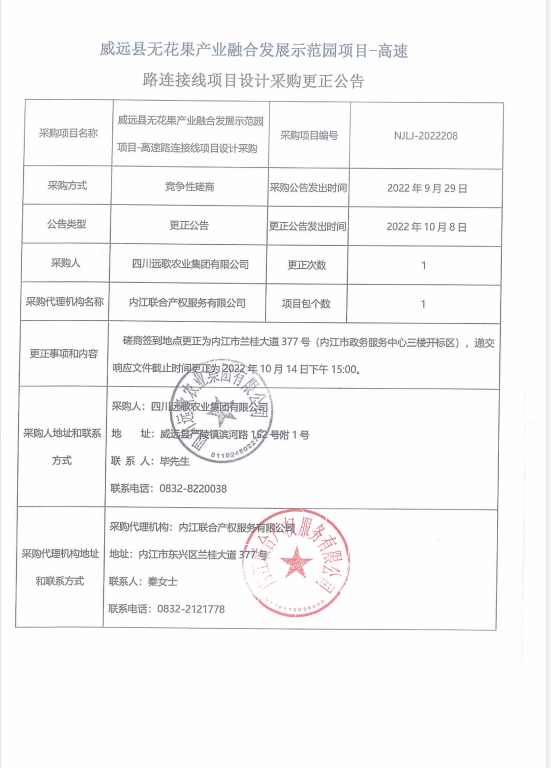 威远县无花果产业融合发展示范园项目-高速路连接线项目设计采购更正公告
