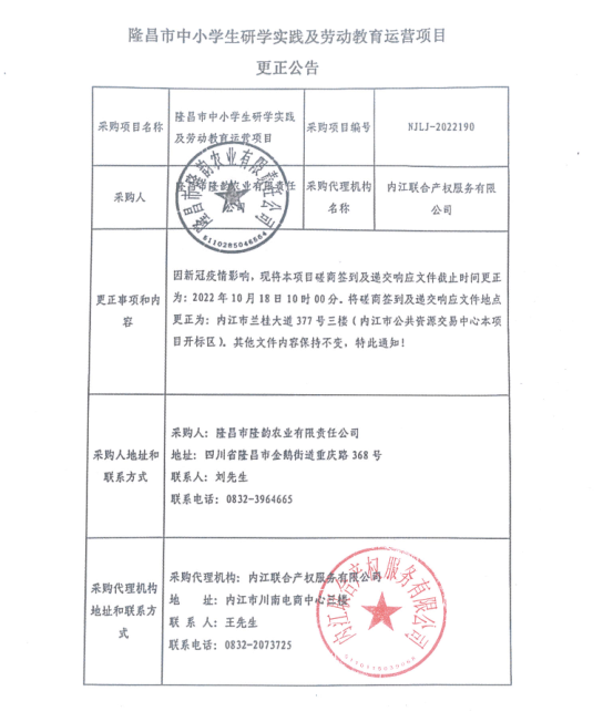 隆昌市中小学生研学实践及劳动教育运营项目更正公告
