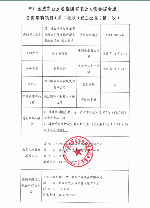 四川振威实业发展集团有限公司债券综合服务商选聘项目(第二批次)更正公告(第二次)