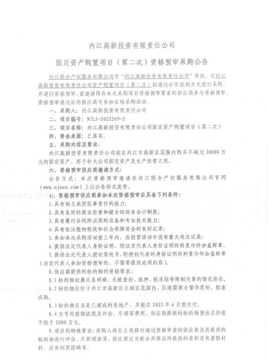 内江高新投资有限责任公司固定资产购置项目(第二次)资格预审采购公告