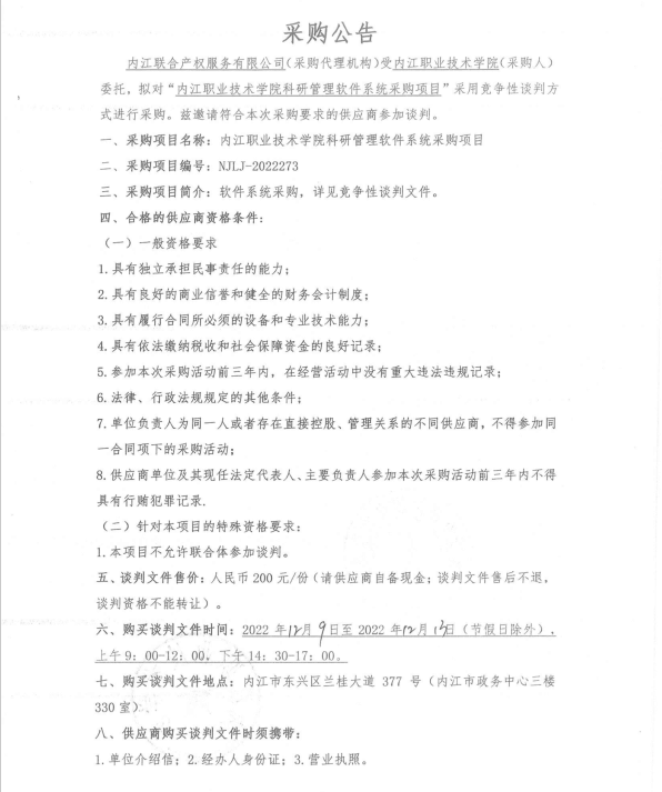 内江职业技术学院科研管理软件系统采购项目采购公告