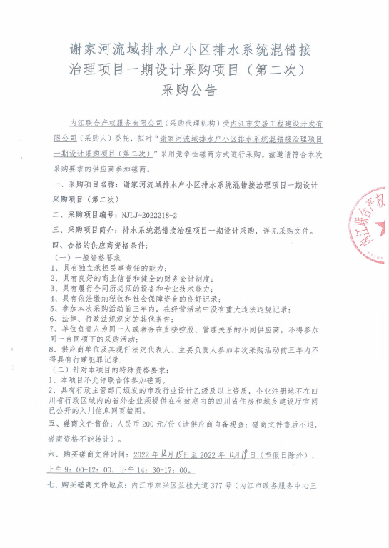 谢家河流域排水户小区排水系统混错接治理项目一期设计项目(第二次)采购公告