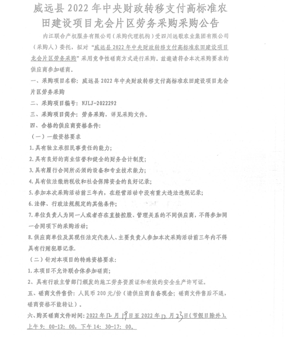 威远县2022年中央财政转移支付高标准农田建设项目龙会片区劳务采购公告