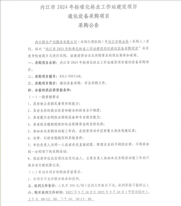 内江市2024年标准化林业工作站建设项目通讯设备采购项目采购公告