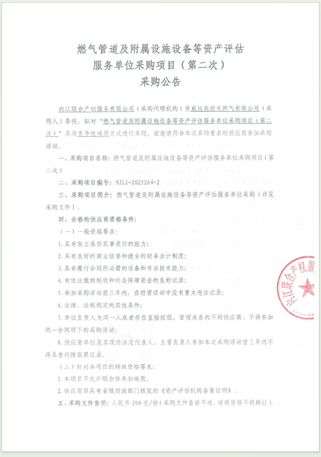 燃气管道及附属设施设备等资产评估服务单位采购项目(第二次)采购公告