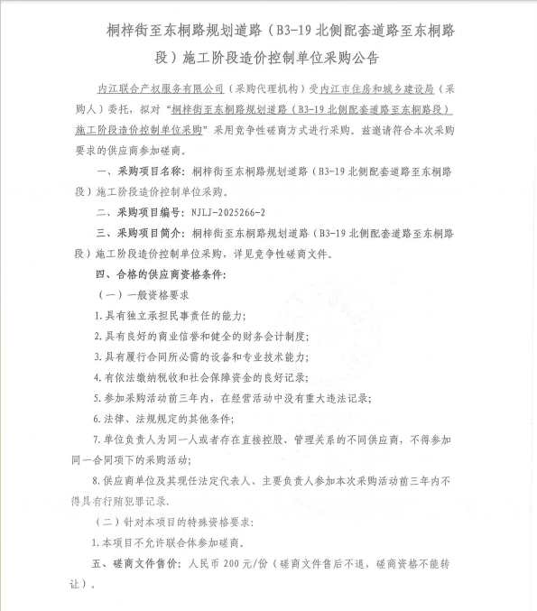 桐梓街至东桐路规划道路(B3-19北侧配套道路至东桐路段)施工阶段造价控制单位采购公告