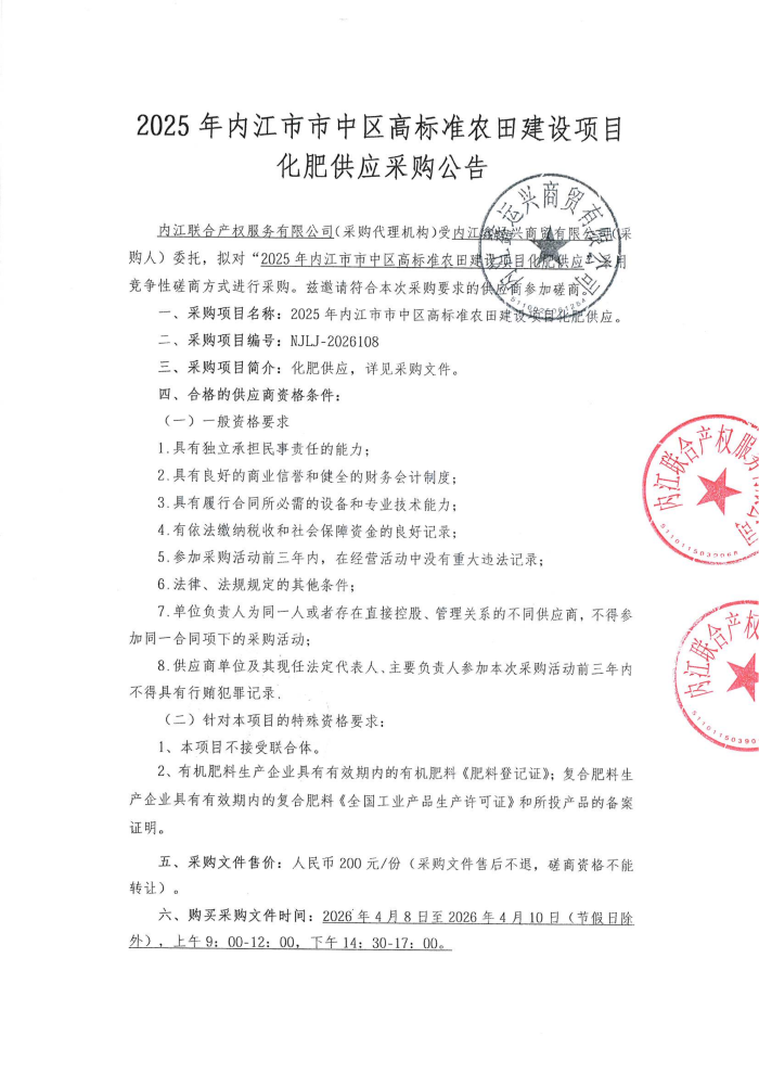 2025年内江市市中区高标准农田建设项目化肥供应采购公告