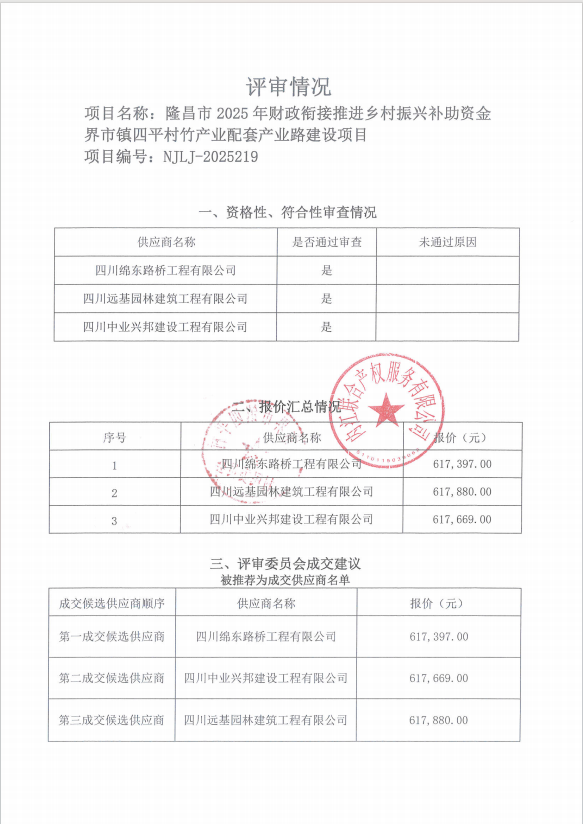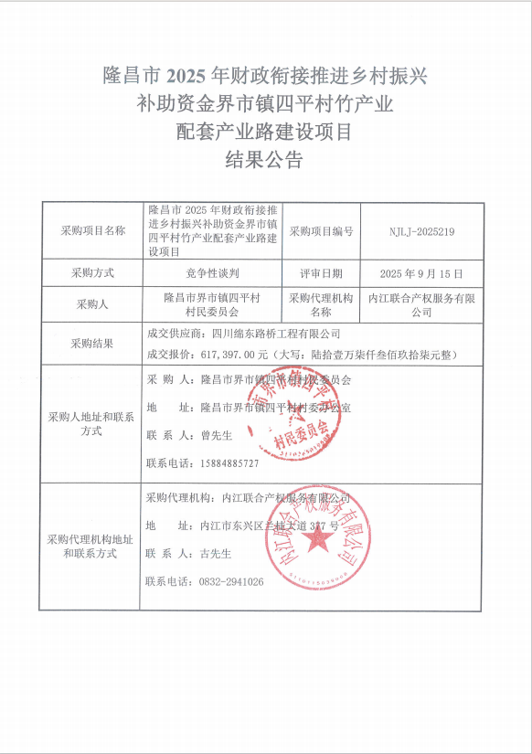 隆昌市2025年财政衔接推进乡村振兴补助资金界市镇四平村竹产业配套产业路建设项目结果公告