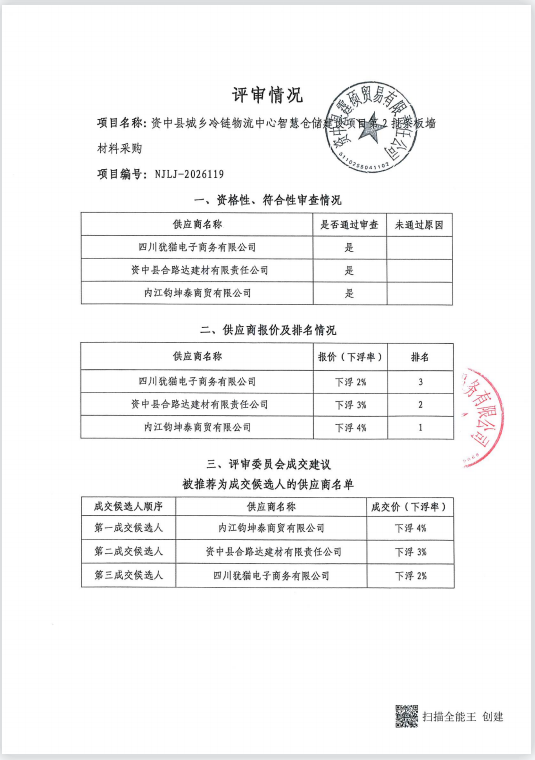 资中县城乡冷链物流中心智慧仓储建设项目第2批条板墙材料采购结果公告
