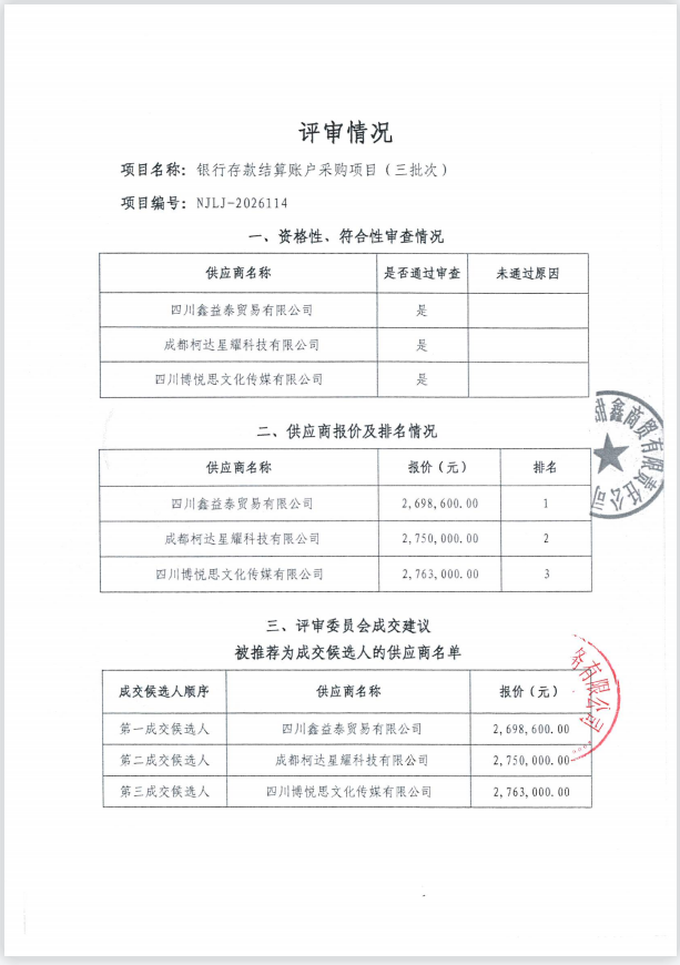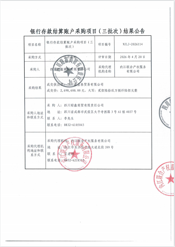银行存款结算账户采购项目(三批次)结果公告